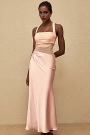Blush Pink Halter Neck Satin Maxi Dress with Sheer Waist Taina Pink Mesh Panel Ruched Maxi Dress Evening Dress Prom, black tie events, formal weddings, and upscale parties