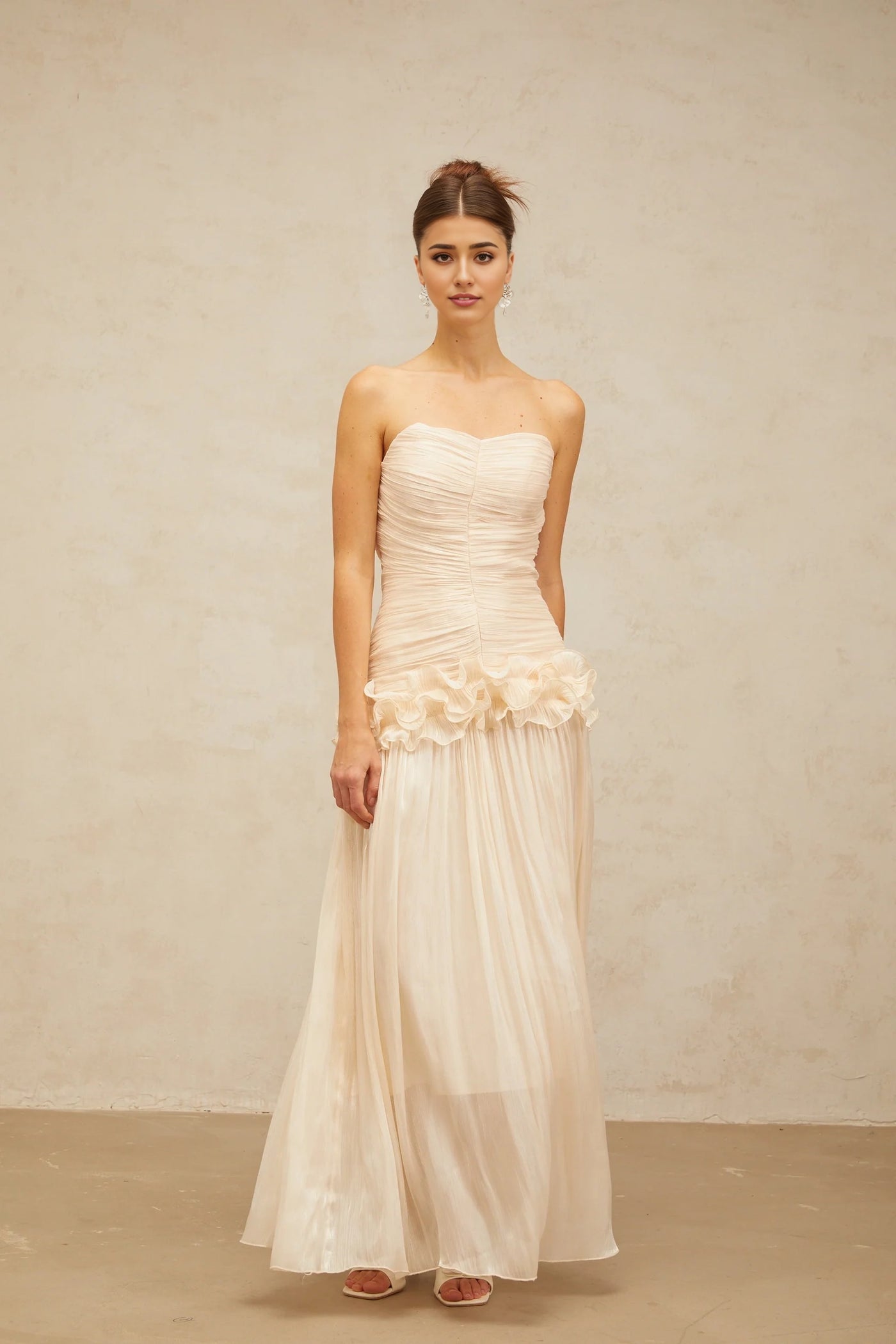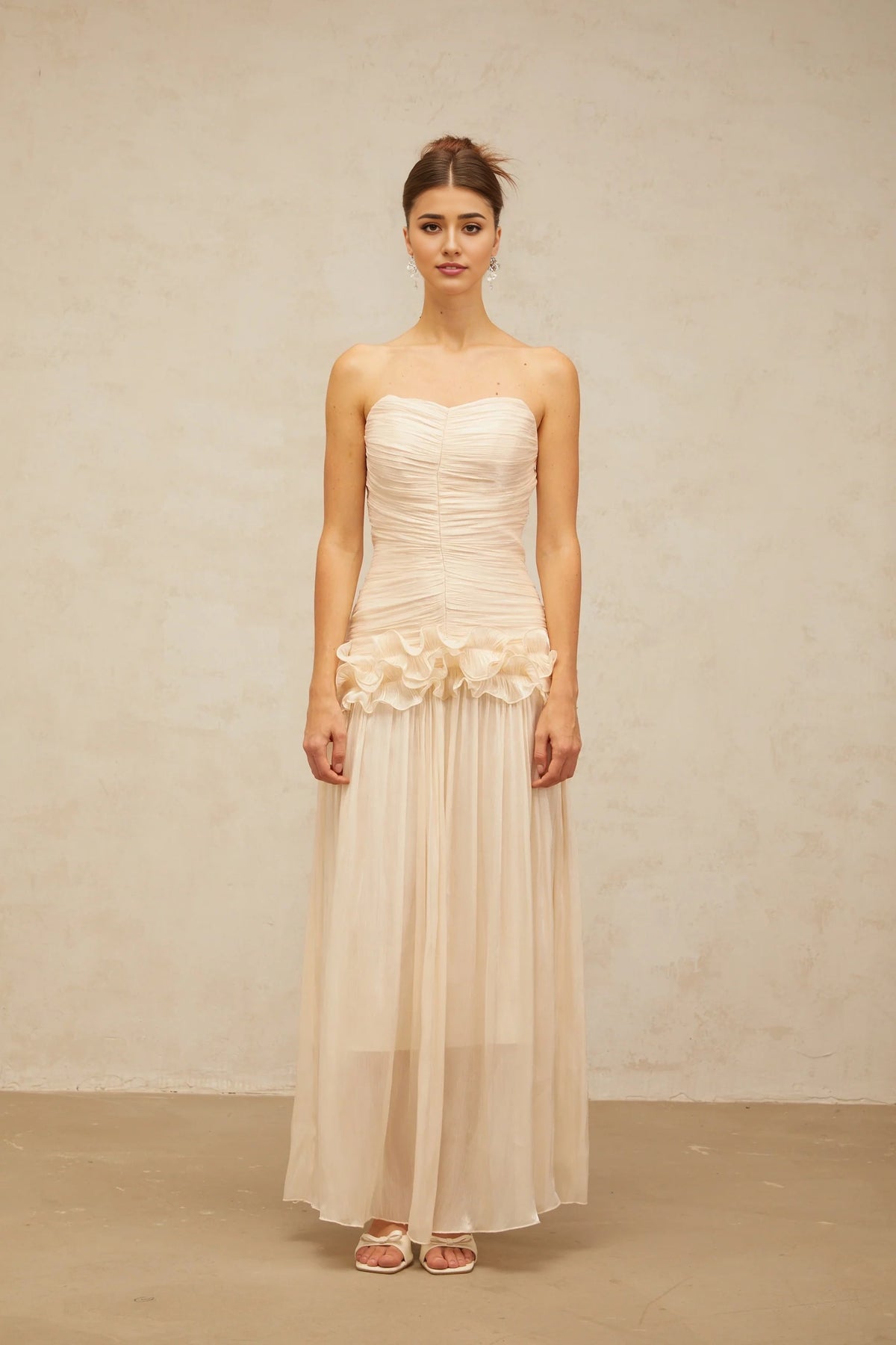 Blush Strapless Ruffled Chiffon Maxi Dress neutrals ruffled pleated maxi dress Evening Dress Prom, black tie events, formal weddings, and upscale parties