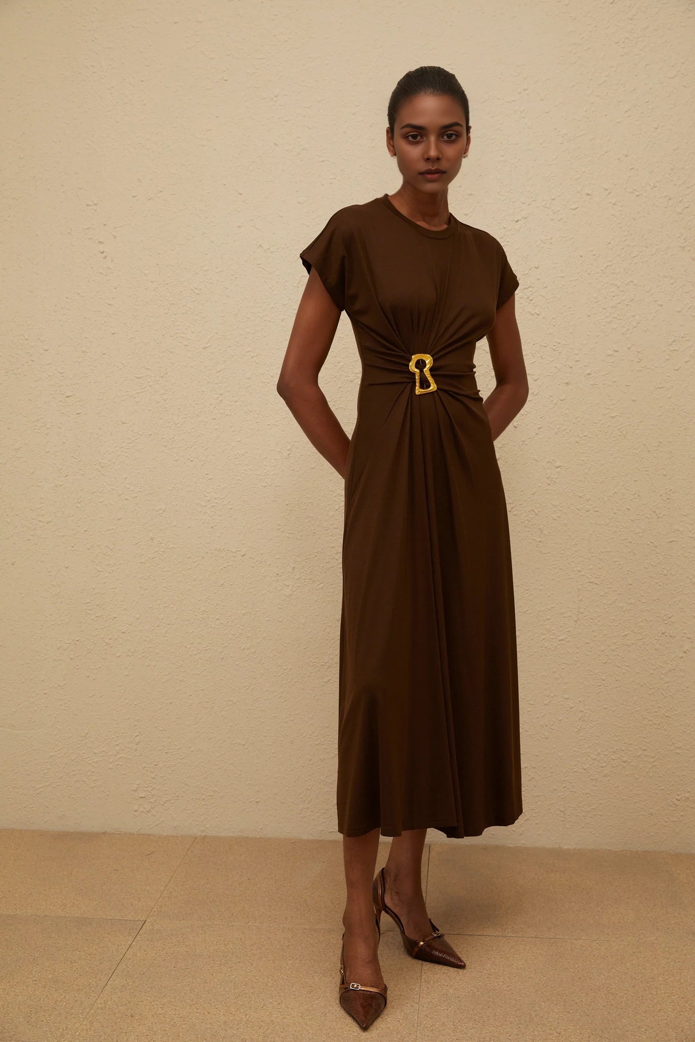 Brown Cap - Sleeve Midi Dress with Gold Buckle Brown Gathered Keyhole Midi Dress Evening Dress