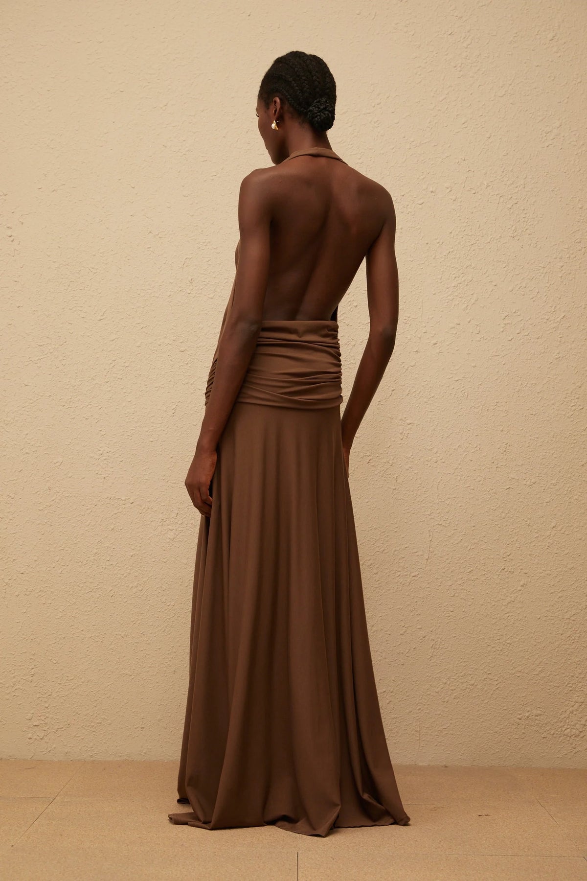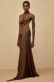 Brown Halter Neck Maxi Dress with Open Back Minna Brown Halterneck Twisted Maxi Dress Evening Dress