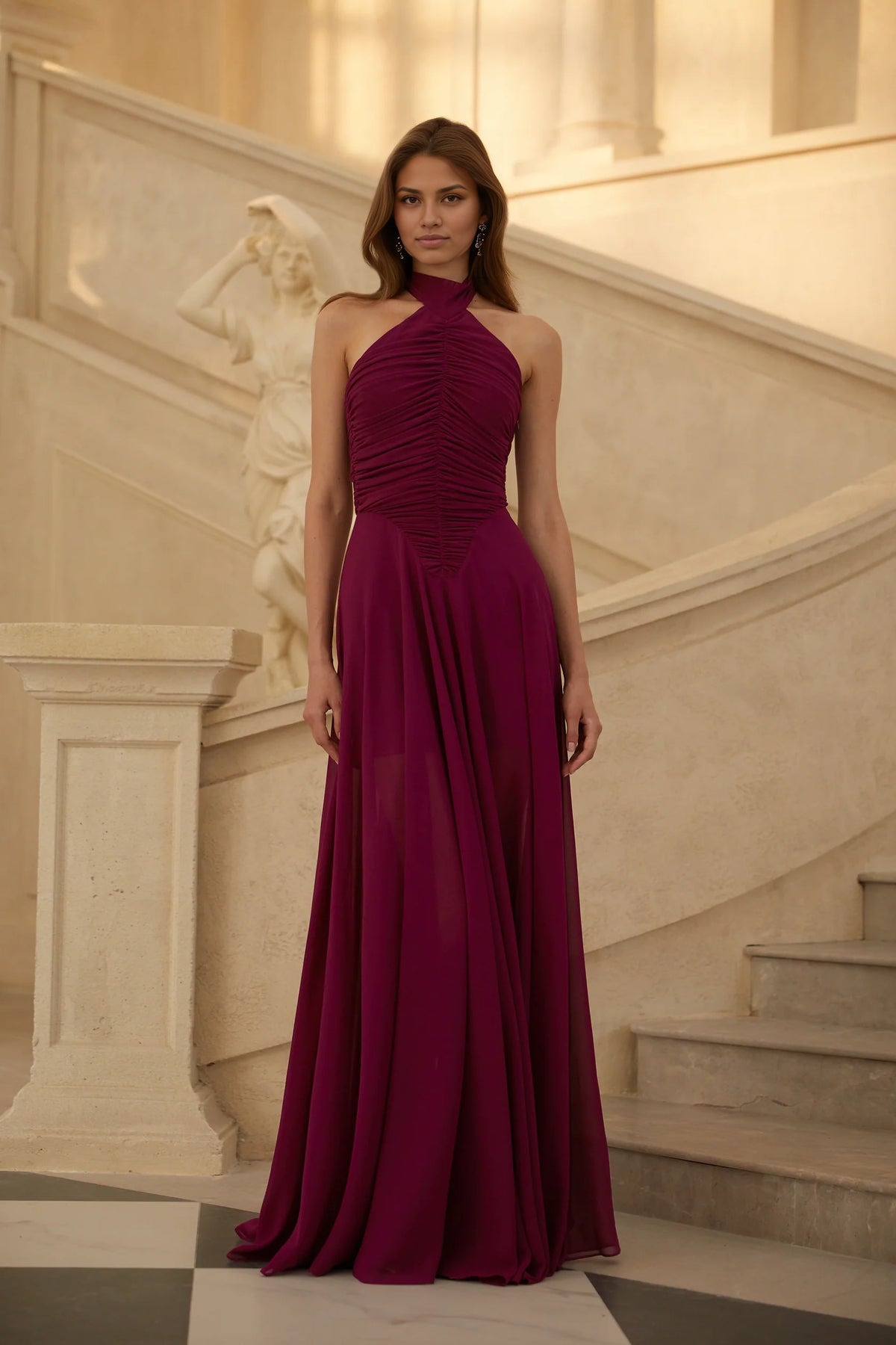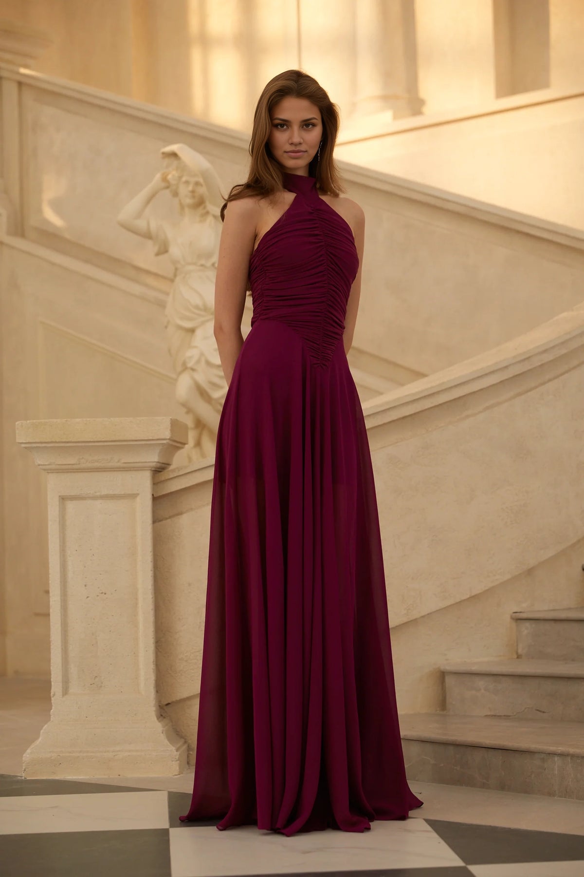 Burgundy Halter Neck Ruched Maxi Dress Kerstin Purple Ruched Maxi Dress Evening Dress Prom, black tie events, formal weddings, and upscale parties