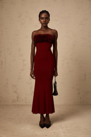 Burgundy Strapless Faux Fur Trim Midi Dress Pauline red faux-fur off-shoulder mesh midi dress black tie events, formal weddings, and upscale partie