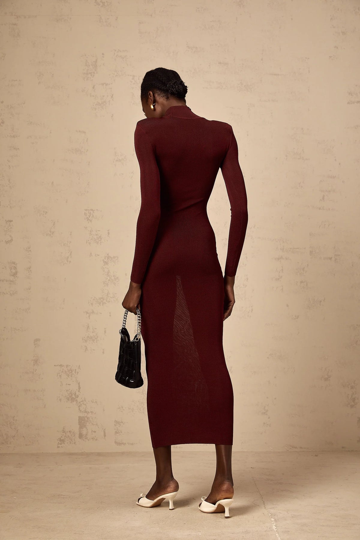 Burgundy Turtleneck Sheer Panel Midi Dress red semi-sheer knitted midi dress Evening Dress Prom, black tie events, formal weddings, and upscale parties
