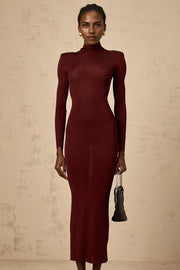 Elevate your style with this Burgundy Turtleneck Sheer Panel Midi Dress. It features a sleek turtleneck, long sleeves, and a sheer panel detail at the back for a touch of allure. The form - fitting silhouette flatters your figure, making it perfect for evenings out or sophisticated gatherings.