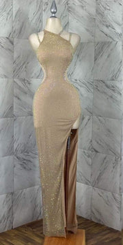 Champagne gold dress adorned with sparkling rhinestones featuring a hanging neck design and high slit, slim fit Prom, black tie events, formal weddings, and upscale parties