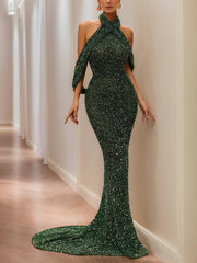 Column Halter Sleeveless Sweep Train Sequined Evening Dresses with Sexy Open Back simple gentle atmospheric and unique desi Bring summer colors to enhance whiteness