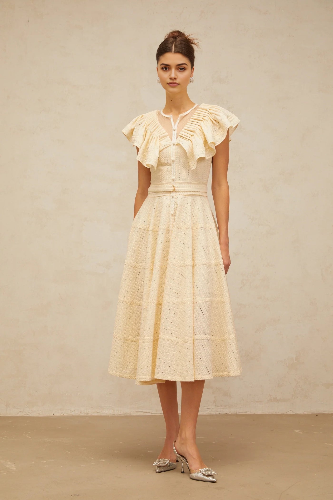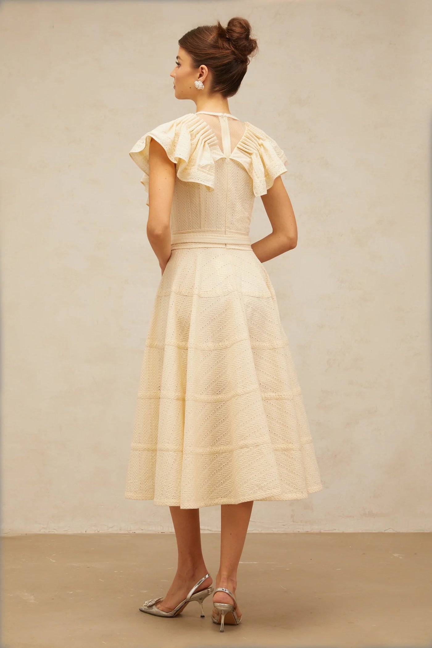 Cream Ruffled Sleeve Midi Dress with Eyelet Detailing neutrals belted pointelle-trim ruffled midi dress Evening DressProm, black tie events, formal weddings, and upscale parties