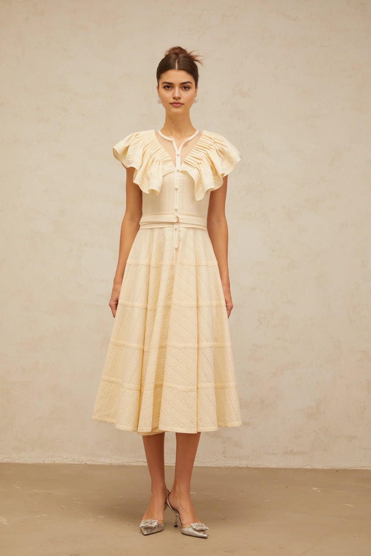 Embrace vintage charm with this Cream Ruffled Sleeve Midi Dress. It features delicate ruffled sleeves, intricate eyelet detailing throughout, a button - front design, and a matching belt to accentuate the waist. Perfect for garden parties, weddings, or any occasion where you want to showcase timeless elegance.