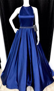 Deep blue satin dress with high neckline and sleeveless design, featuring a sparkling diamond waistband at the high waist, suitable for dinners, dances, and more Prom, black tie events, formal weddings, and upscale partie