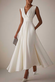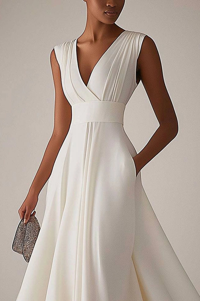 Evening Elegant Dress Sleeveless Deep V Neck Pleated Design Ball Gown Maxi Dress