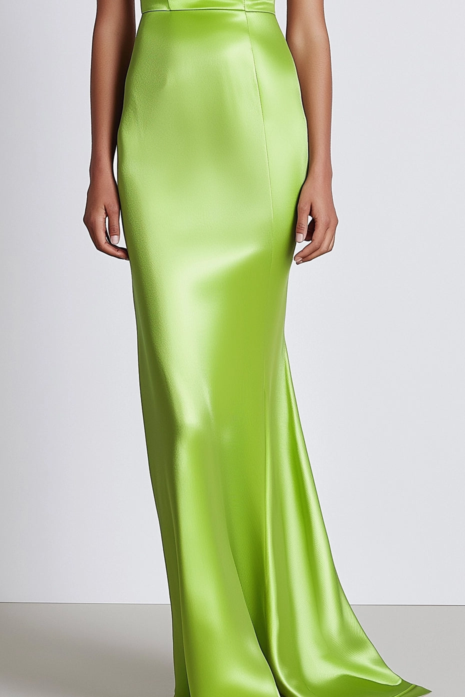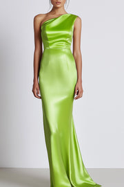 Evening Formal Dress Green Satin One Shoulder Floor-Length Dress