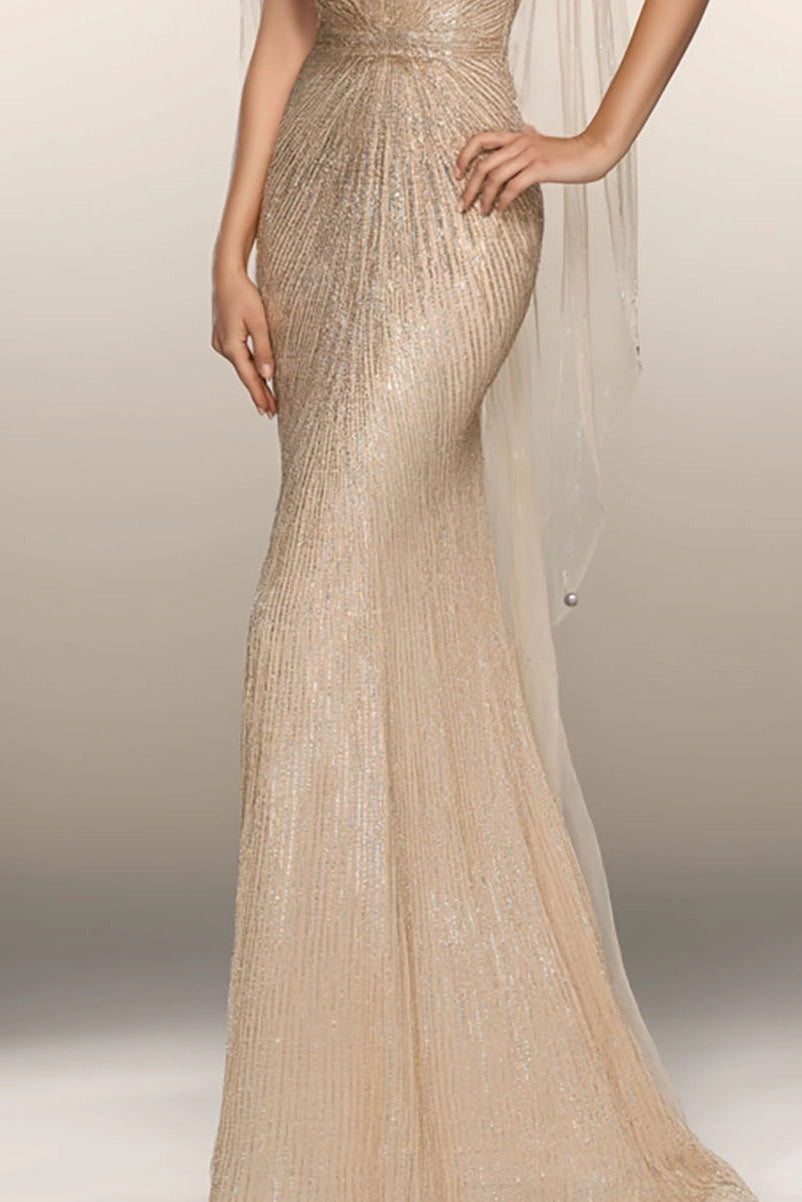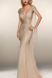 Formal Evening Gown Gold Deep V Tulle Beaded Bodycon Floor-Length Dress