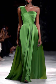 Formal Prom Dress Green Satin One-Shoulder Pleated Floor-Length Dress