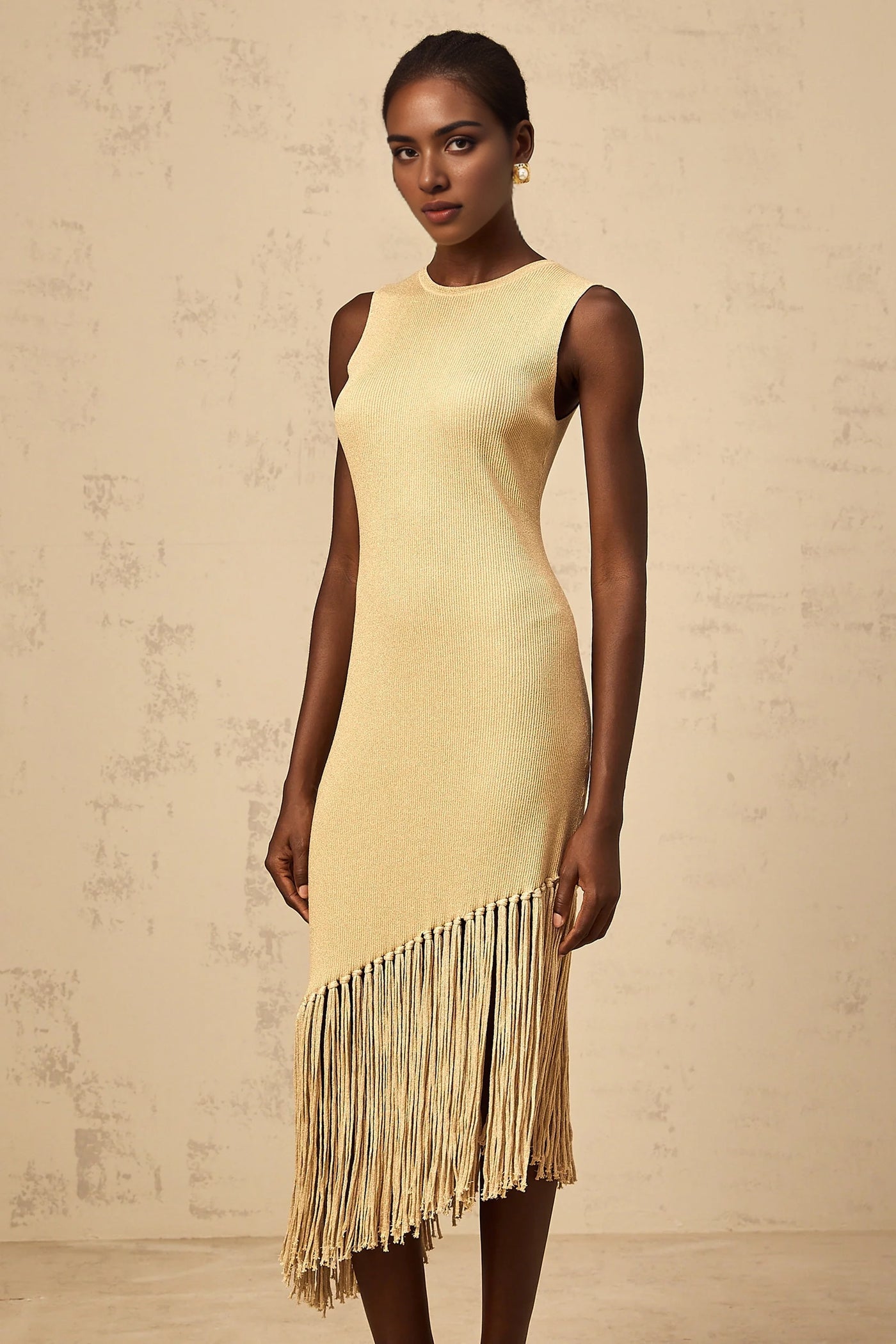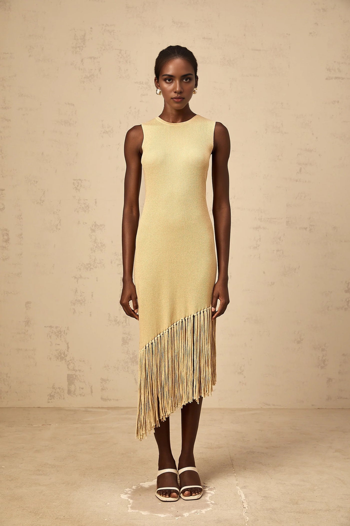 Gold Sleeveless Midi Dress with Asymmetric Fringe Hem Yseult neutrals asymmetrical-fringe knitted midi dress Evening Dress Prom, black tie events, formal weddings, and upscale parties