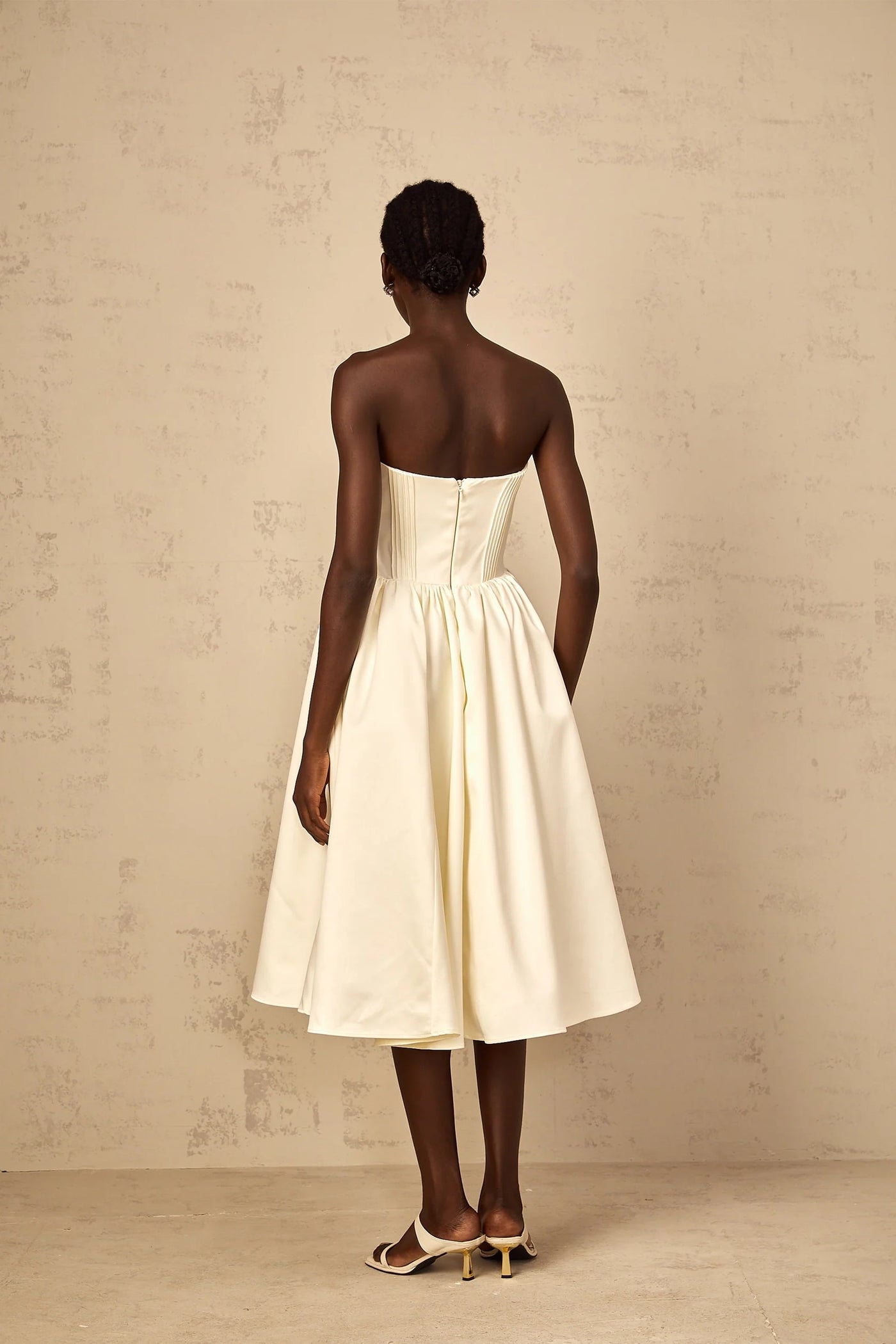 Ivory Strapless Corset Midi Dress with Full Skirt Noor White Off-Shoulder Shirred Midi Dress Evening Dress Prom, black tie events, formal weddings, and upscale parties
