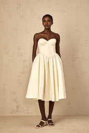 Embrace timeless elegance with this Ivory Strapless Corset Midi Dress. It features a structured corset bodice, a strapless design, and a full, flowing midi skirt. Perfect for weddings, cocktail parties, or any occasion where you want to exude classic charm.