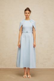 Elevate your elegance with this Light Blue Cape - Sleeve Embellished Midi Dress. It features chic cape sleeves, delicate embellishments at the neckline and waist, and a flowing midi silhouette. Perfect for formal events, weddings, or any occasion where you want to showcase refined charm.