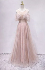 Light pink chiffon dress, round neck off shoulder sequin embroidery suitable for dinner parties Prom, black tie events, formal weddings, and upscale parties