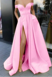 Light pink satin dress with one shoulder, high waist, and large skirt with high slit, suitable for dinner parties
