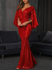 Mermaid Floor Length Long Sleeve V Neck Prom Dress Sequined with Bow(s) Sequin simple gentle atmospheric and unique desi Bring summer colors to enhance whiteness - US 2 / UK 6 / EU 32
