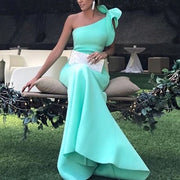Mint green dress with one shoulder design and a three-dimensional bow, suitable for dinners Prom, black tie events, formal weddings, and upscale parties