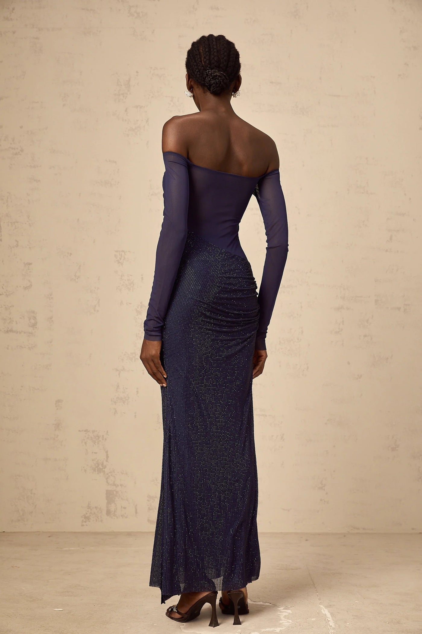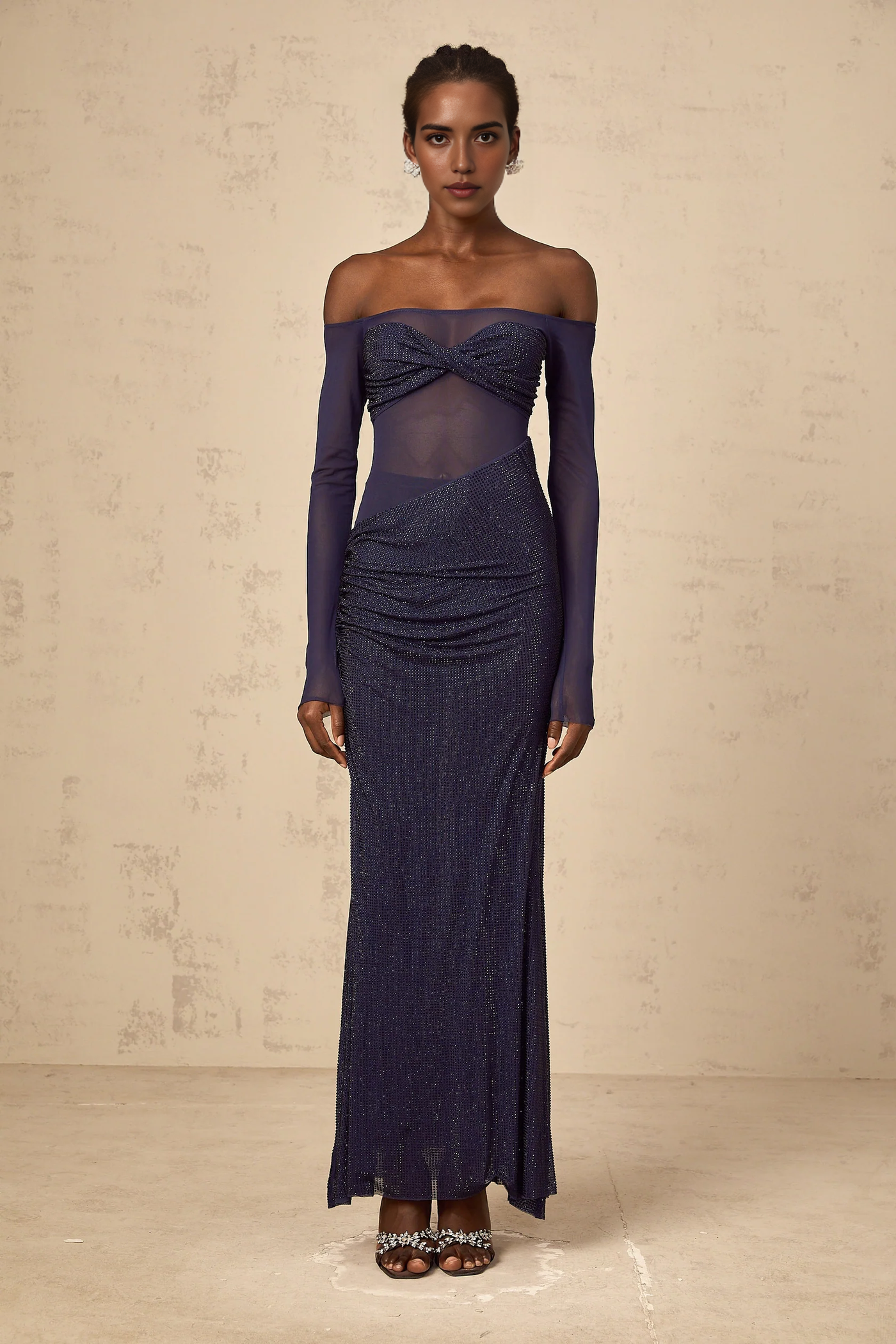 Navy Blue Off - Shoulder Mesh Maxi Dress with Sparkle Detail Hermine dark-blue embellished tulle-panel corset maxi dress Evening Dress Prom, black tie events, formal weddings, and upscale parties