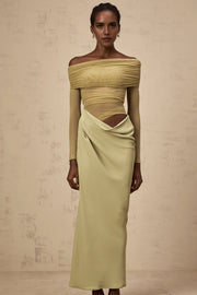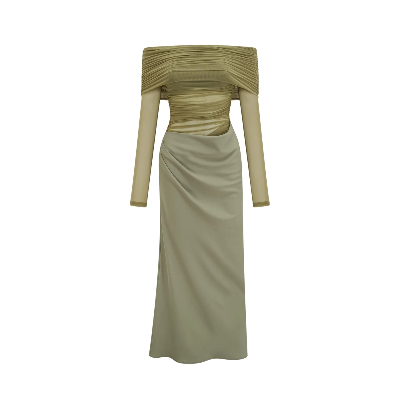 Elevate your evening elegance with this Olive Green Off - Shoulder Mesh Maxi Dress. It features an off - shoulder neckline, sheer mesh panels with ruched detailing, and a chic cutout at the waist. The flowing maxi skirt adds grace, making it perfect for weddings, formal events, or special occasions where you want to make a sophisticated statement.