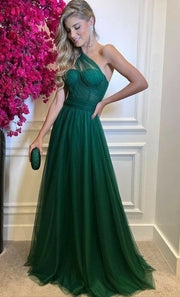 One Shoulder Green Prom Dress A Line Tulle Formal Evening Gowns