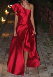 One Shoulder Sleeveless Ruffled Side Slit Pleated A-Line Evening Dress simple gentle atmospheric and unique desi Bring summer colors to enhance whiteness