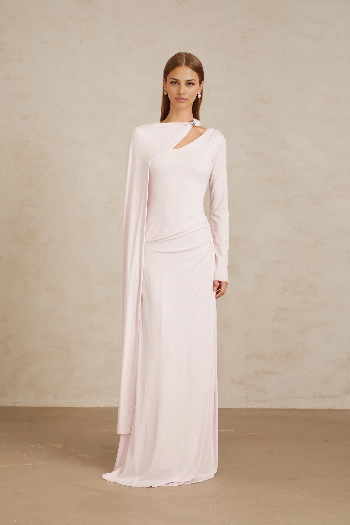 Embrace graceful charm with this Pale Pink Asymmetric Draped Maxi Dress. It features an asymmetric neckline with a draped detail, long sleeves, and a flowing maxi silhouette. Perfect for formal events, weddings, or any occasion where you want to showcase elegant femininity.