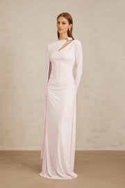 Pale Pink Asymmetric Draped Maxi Dress with Long Sleeve Josette Pink Diagonal Shawl Fitted Maxi Dress Evening Dress Prom, black tie events, formal weddings, and upscale parties