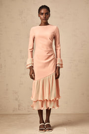 Peach Long Sleeve Midi Dress with Ruffled Hem ruffled-trim panelled midi dress in Pink Evening Dress