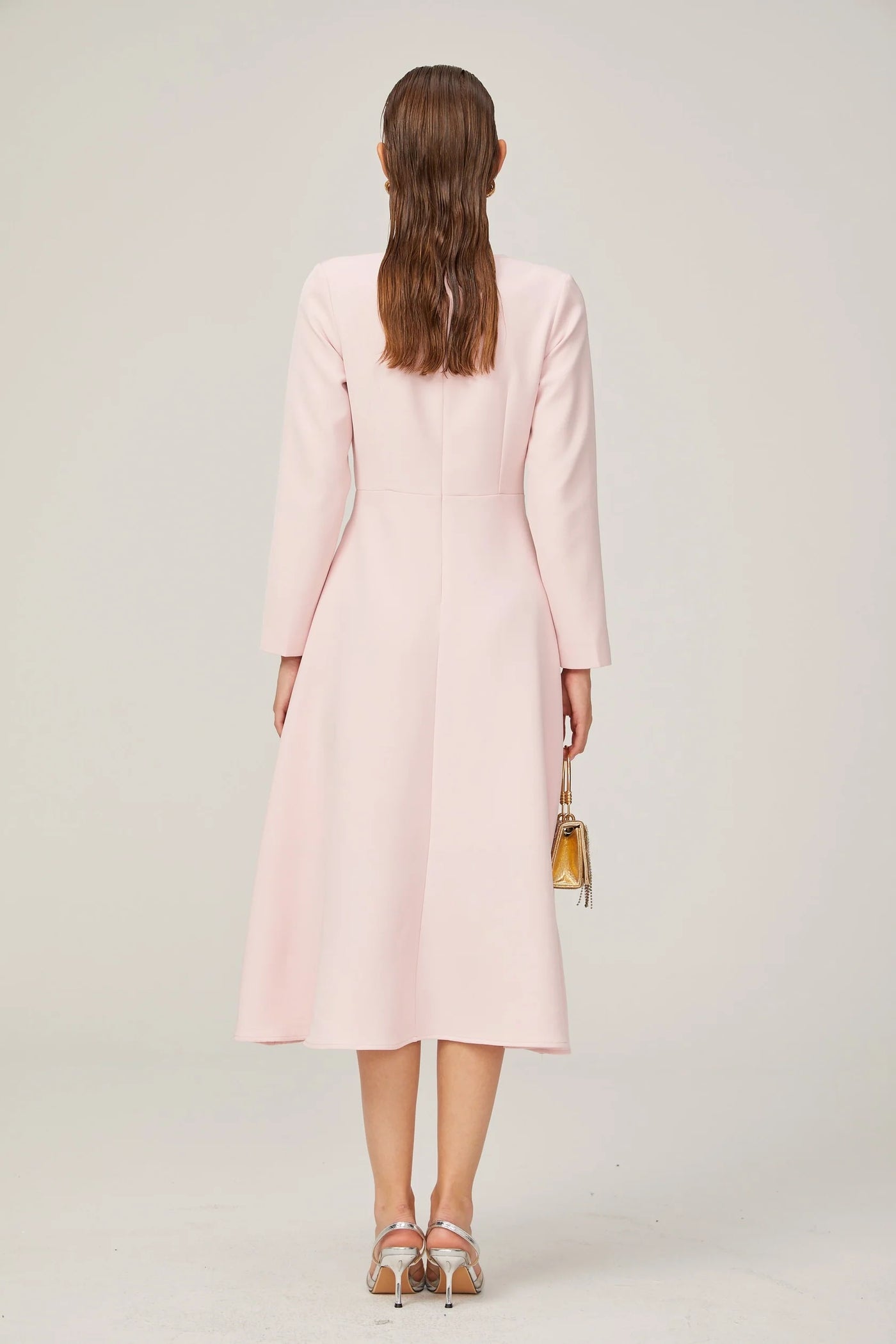 Pink Bow - Accent Long Sleeve Midi Dress Elise pink bow-detail split-neck midi dress Evening Dress Prom, black tie events, formal weddings, and upscale parties