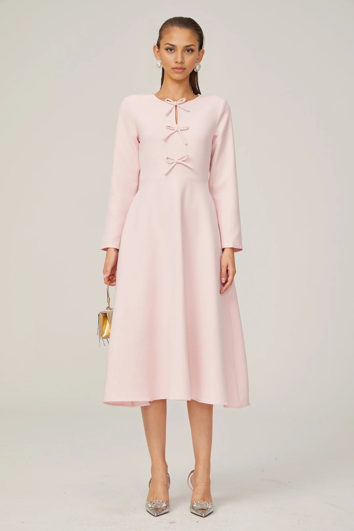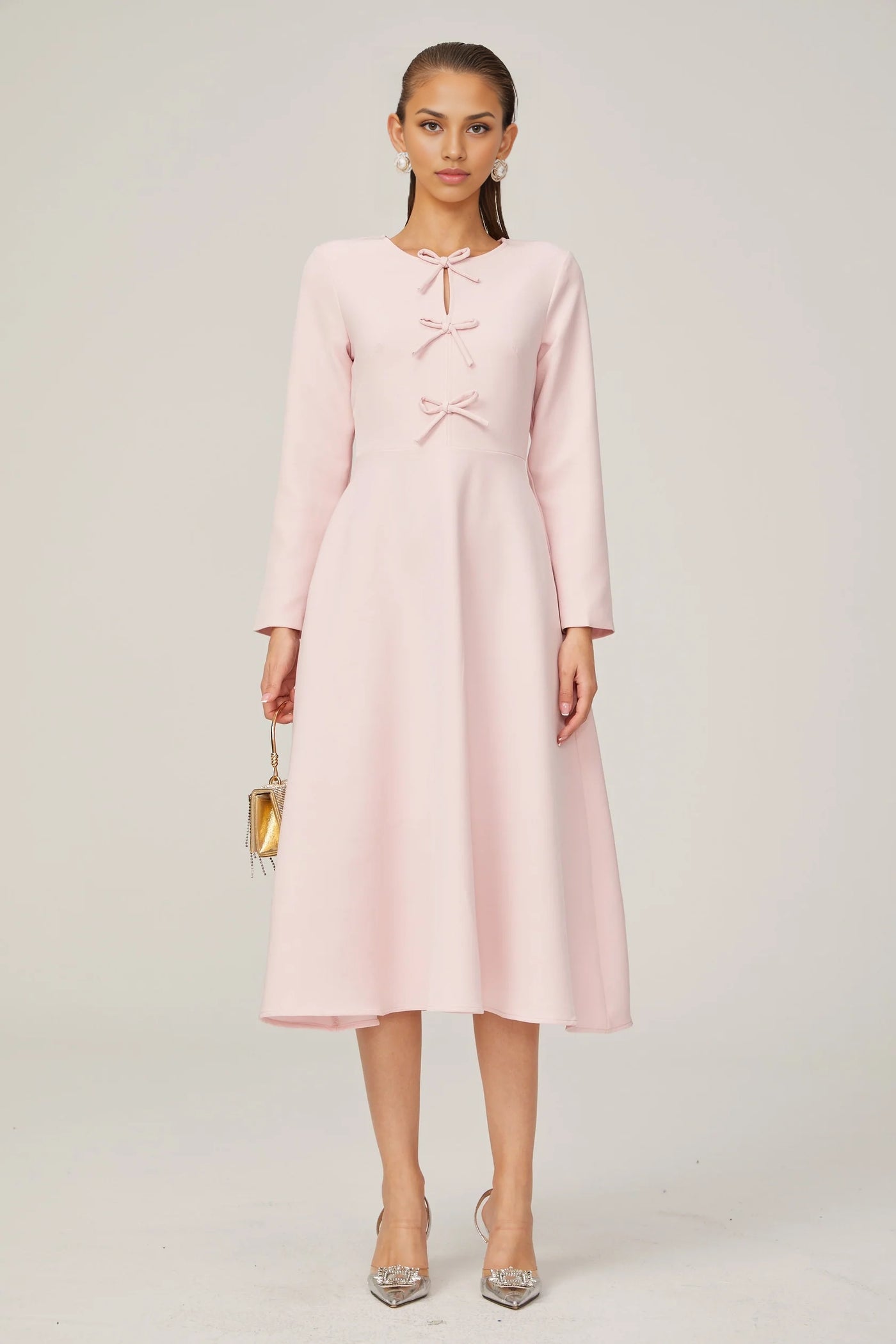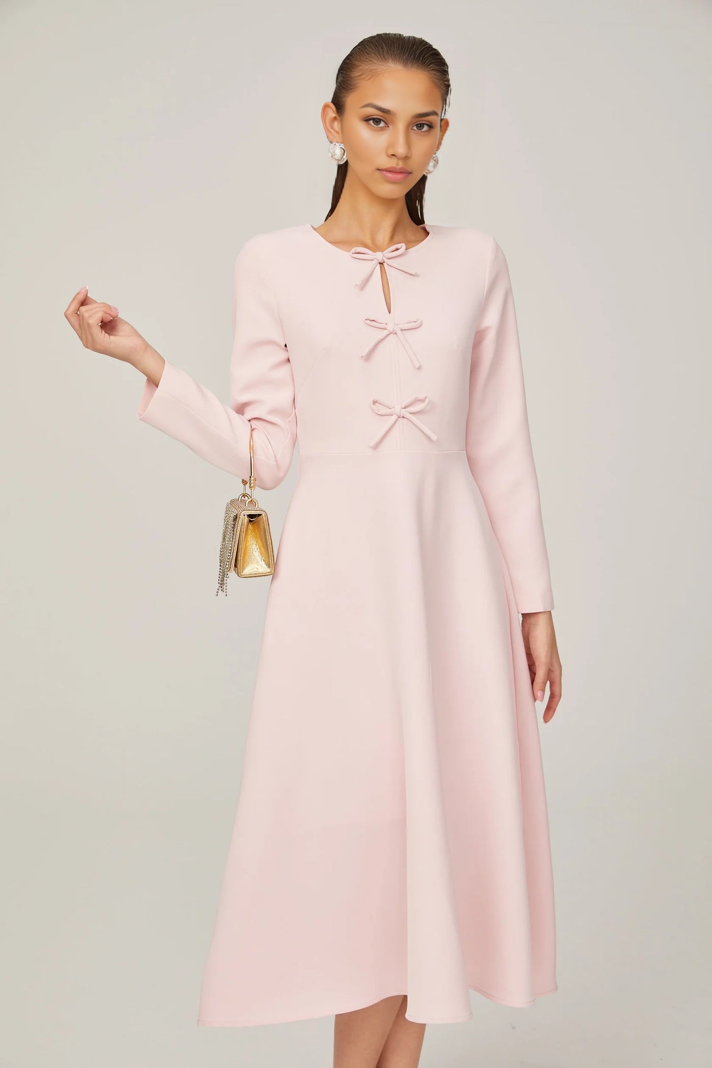 Embrace feminine charm with this Pink Bow - Accent Long Sleeve Midi Dress. It features delicate bow details at the front, long sleeves, and a flowing midi silhouette. Perfect for brunches, tea parties, or any occasion where you want to showcase sweet elegance.
