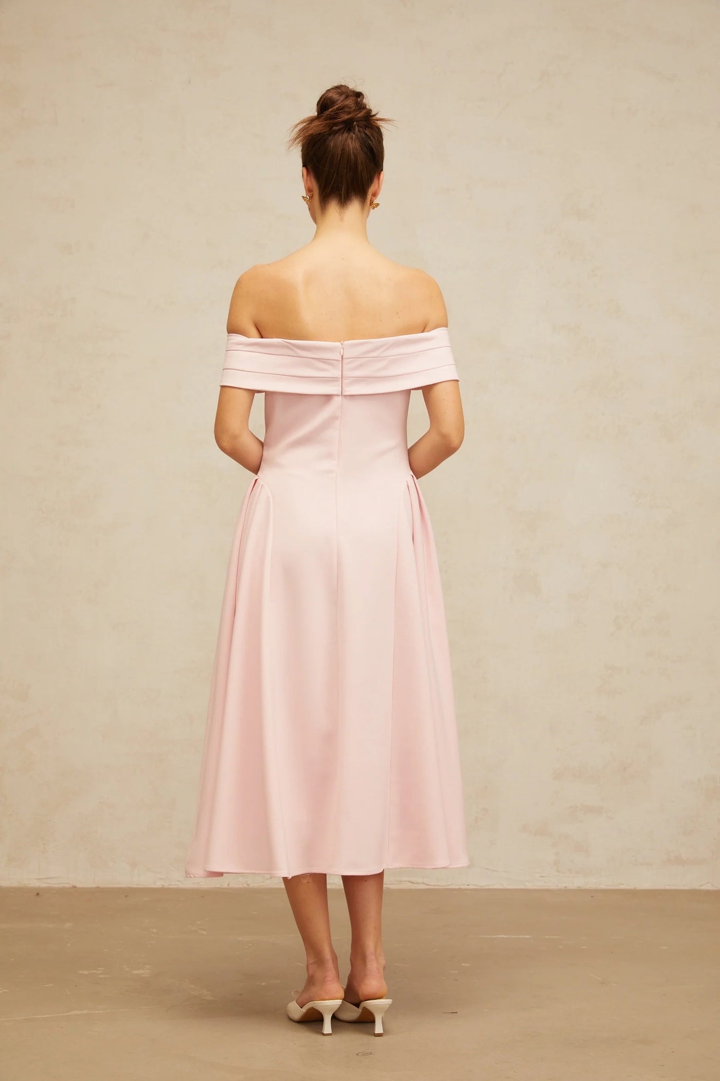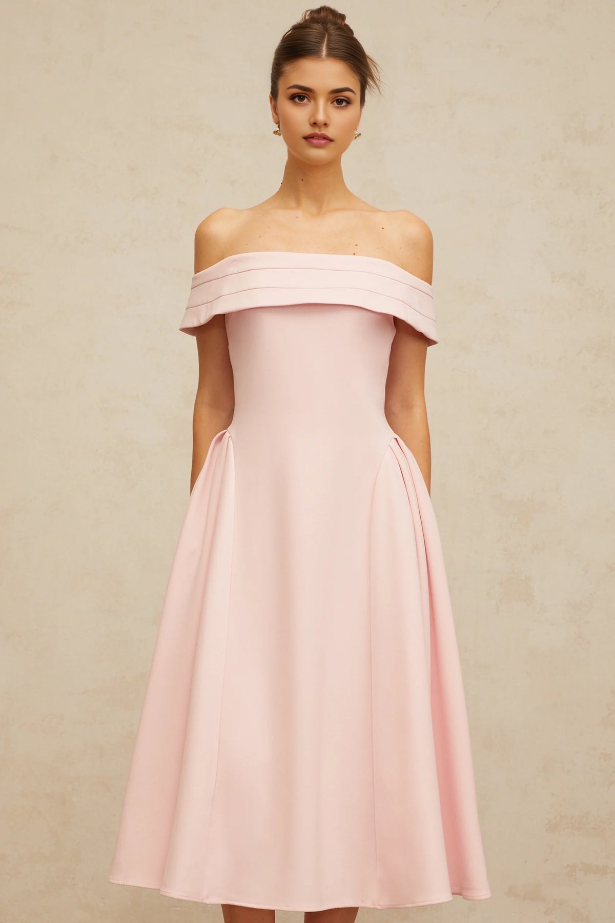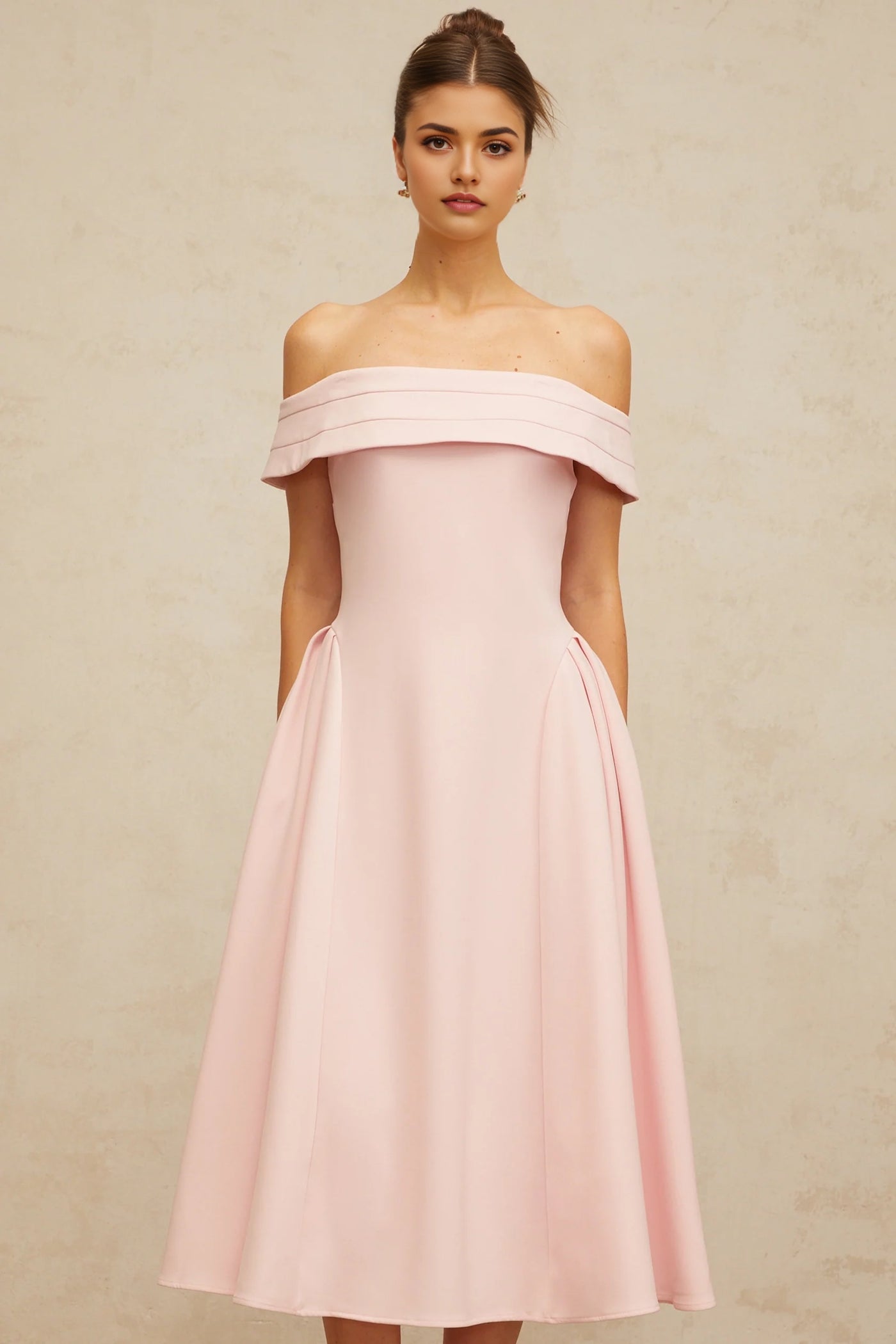 Pink Off - Shoulder Midi Dress with Pleated Detail pink off-shoulder pleated midi dress Evening Dress Prom, black tie events, formal weddings, and upscale parties