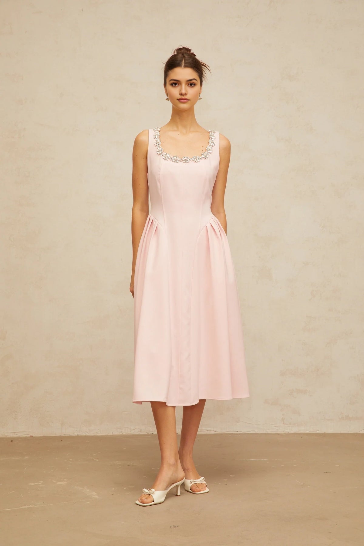 Add a touch of glamour to your wardrobe with this Pink Sleeveless Midi Dress. It features a crystal - embellished neckline that catches the light beautifully, a sleeveless design, and a flowing midi skirt with subtle pleats. Perfect for weddings, cocktail parties, or any occasion where you want to shine with feminine charm.