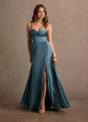 This evening dress features a mermaid silhouette with full pleated skirts for a textured, flowing look. The sweetheart neckline + spaghetti straps add a distinct touch, while the open back brings subtle lightness. The pleated fabric and high slit boost movement, making it ideal for evening events keeping the wearer confident and eye-catching.