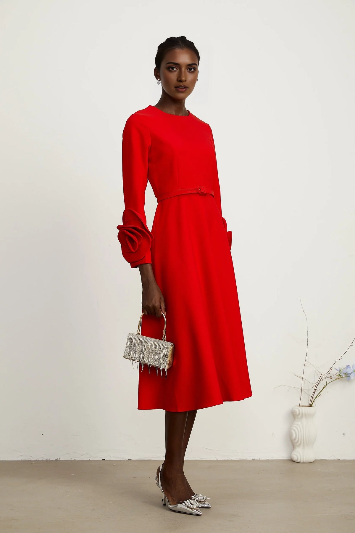 Red Belted Midi Dress with Floral Cuff Detail Aurelia red long-sleeve dress with floral embellishments Evening Dress Prom, black tie events, formal weddings, and upscale parties