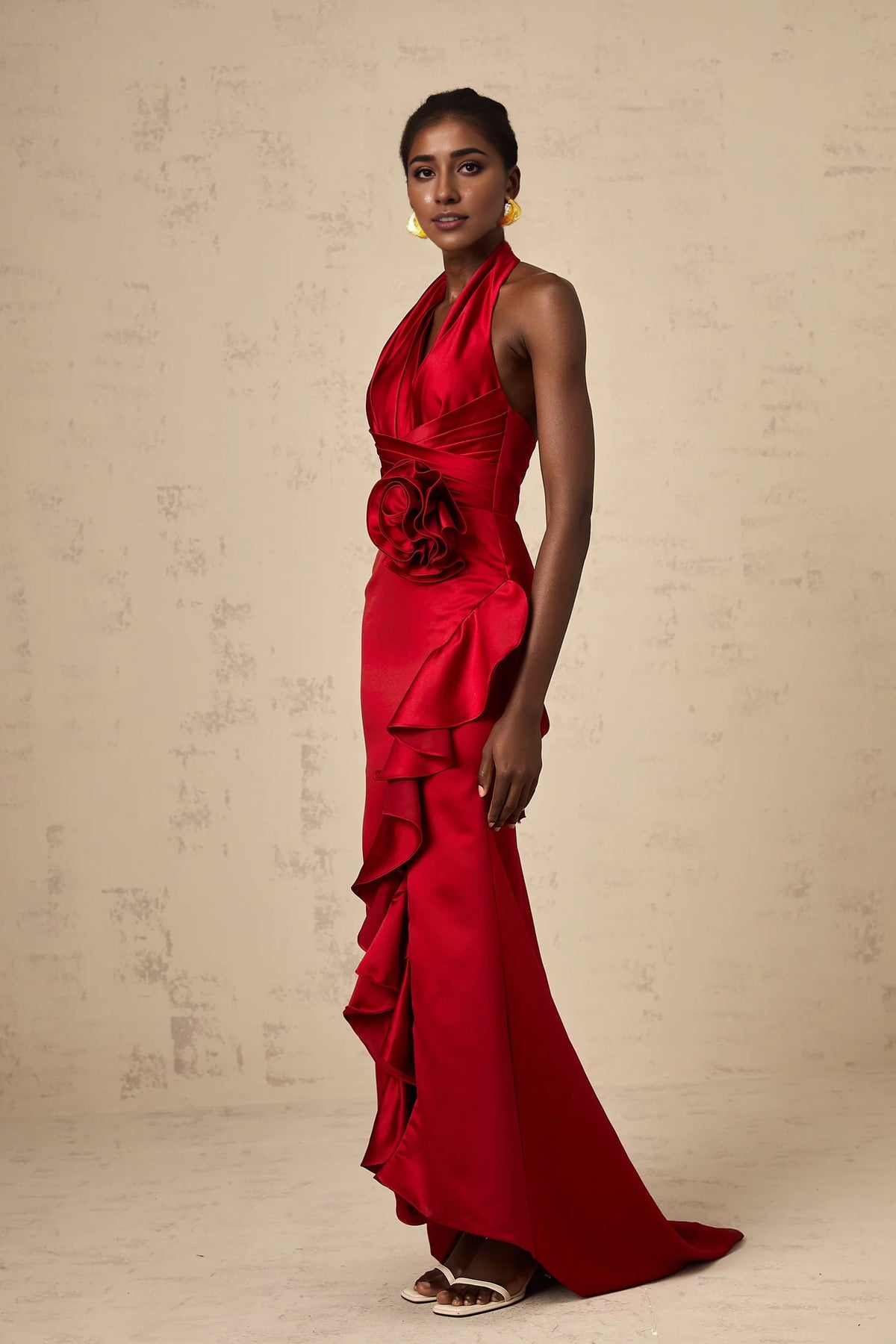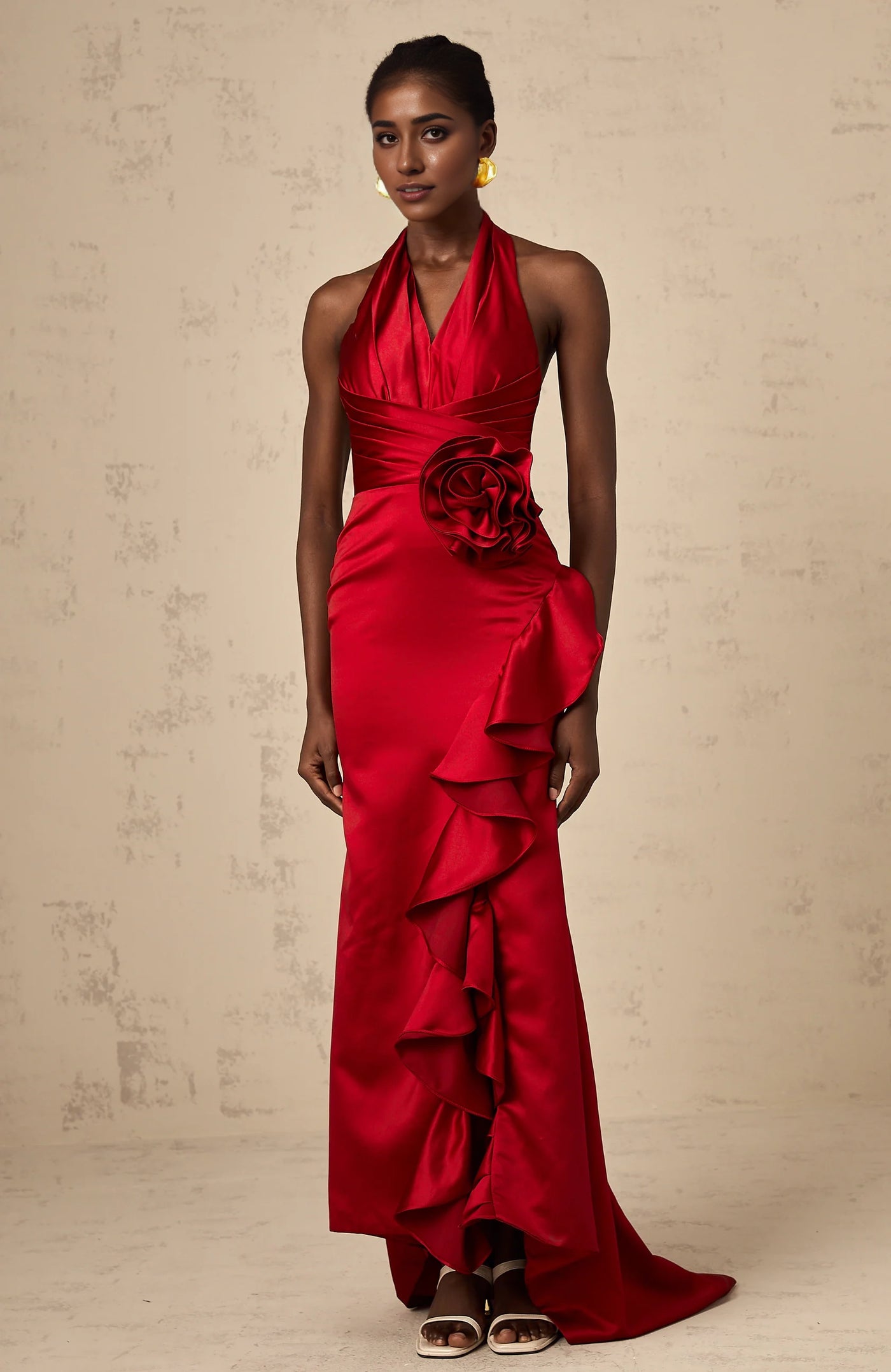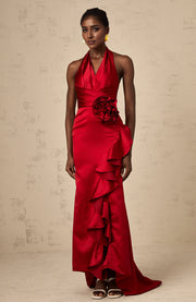 Red Halter Neck Ruffled Satin Maxi Dress red halterneck 3d-petal ruffled maxi dress Evening Dress