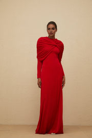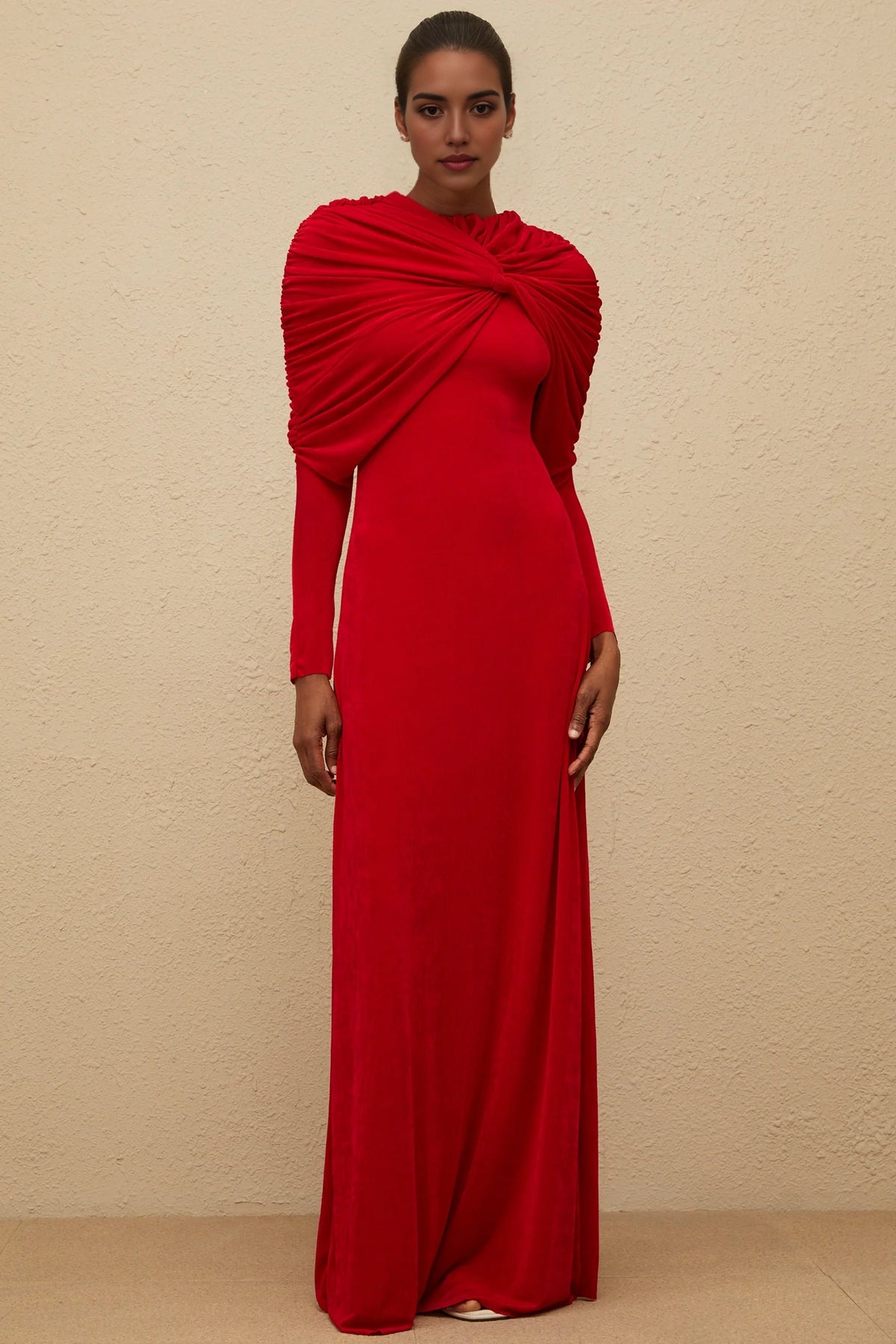 Red Long Sleeve Maxi Dress with Draped Shoulder Detail Moderne Red Cape-Design Ruched Maxi Dress Evening Dress