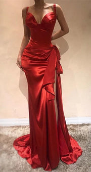 Red satin dress with deep V-neck strap suitable for dinners, dances, and other events Prom, black tie events, formal weddings, and upscale parties