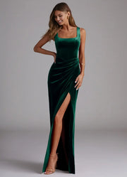 This evening dress features a mermaid silhouette that fits closely through the body before flaring gently for a full, defined look. The square neckline adds a distinct touch, while the crisscross tie-back brings a subtle focal point. The plush fabric enhances its lush shape, and the high slit boosts movement ideal for evening events, keeping the wearer confident and composed.