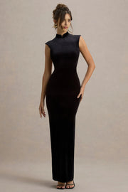 This evening dress has a sheath silhouette for a sleek, figure-hugging fit. The mandarin-collar design brings a rich, refined touch, while the cap-sleeve style adds subtle structure. The keyhole-back detail boosts allure, and the floor-length fit makes it ideal for evening events helping the wearer feel confident and distinguished.