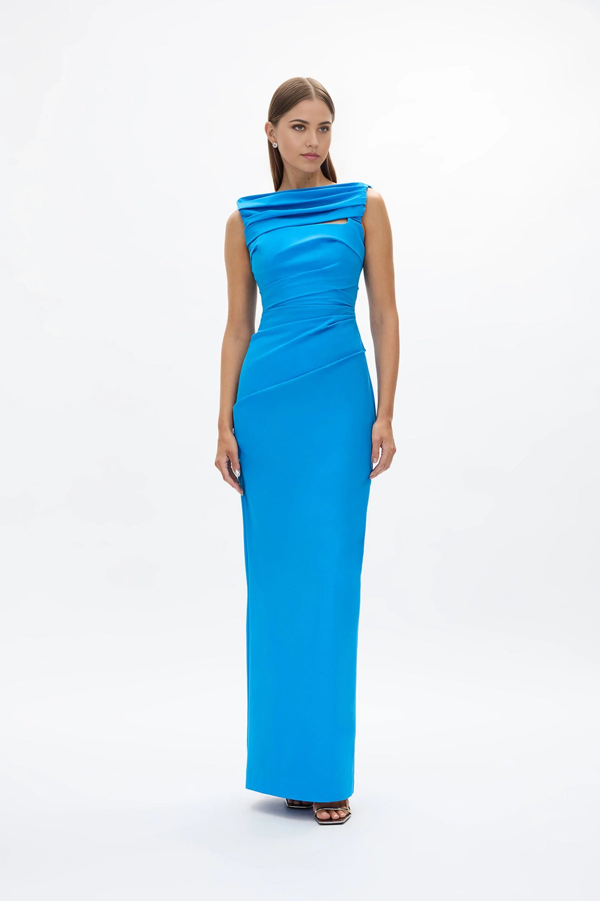 This evening dress features a sheath silhouette with ruched fabric for a textured, tailored look. The cowl neck adds a distinct touch, while the zipper back ensures a secure fit. The structured draping maintains a sleek shape, making it ideal for evening events keeping the wearer confident and composed.