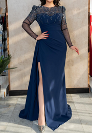 Scoop Long Sleeves Beaded Side Slit Sheath Mother of Bride Dress simple gentle atmospheric and unique desi Bring summer colors to enhance whiteness