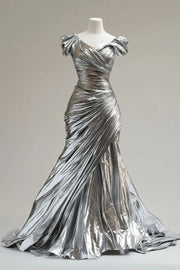 Silver dress, made of metallic luster fabric, with off shoulder design and fluffy short sleeves Prom, black tie events, formal weddings, and upscale parties