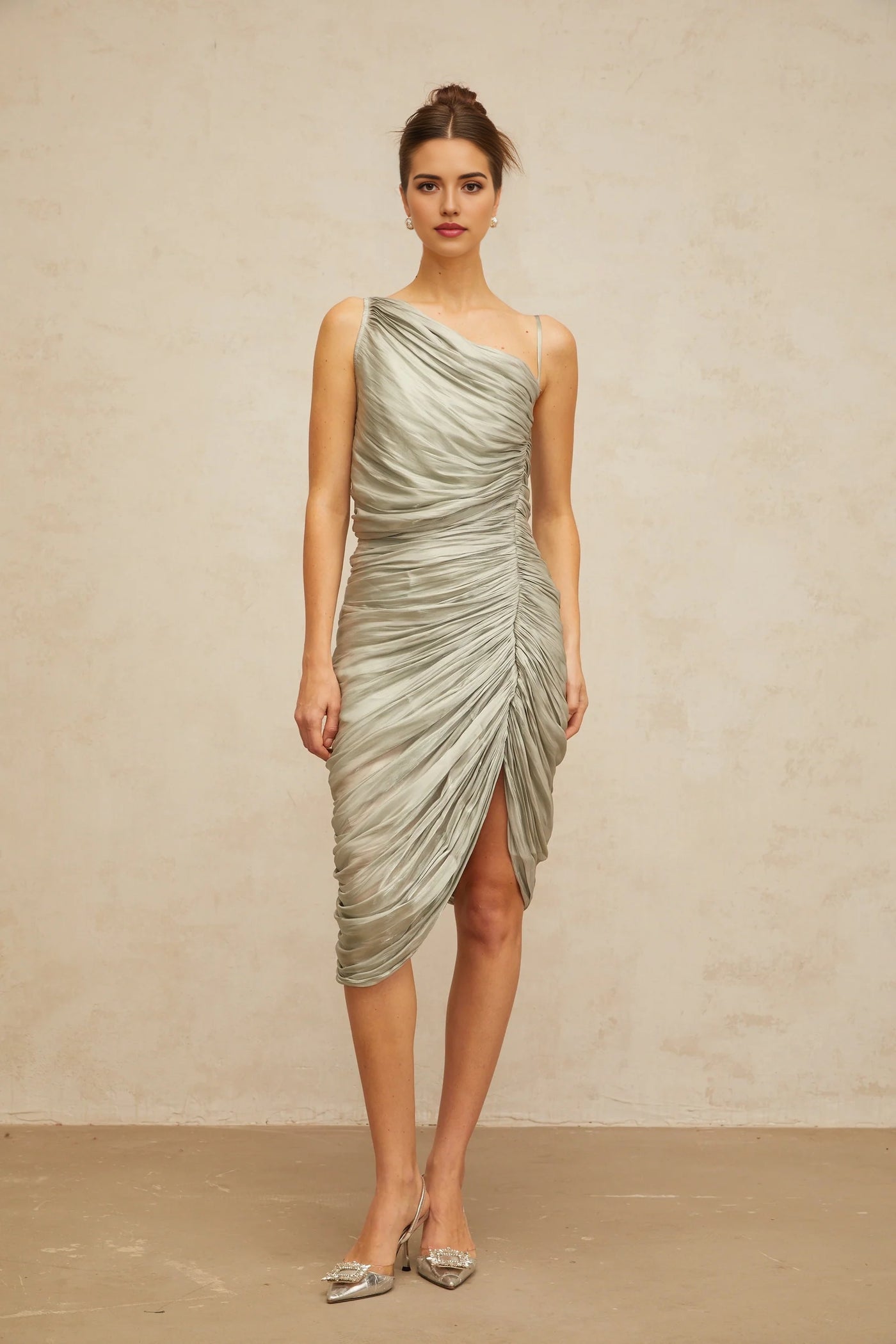 Silver Grey One - Shoulder Ruched Midi Dress with High Slit Lison glossy ruched midi dress in Grayish-green Evening Dress - US 2 / UK 6 / EU 32