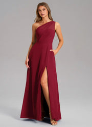 This evening dress features an A-line silhouette that flows smoothly for a balanced, relaxed look. The one-shoulder neckline adds a distinct touch, while the sheer panel back brings subtle texture. The side pocket and high slit boost practicality and movement, making it ideal for evening events keeping the wearer confident and at ease.