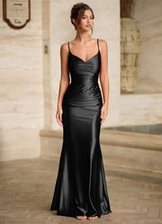 This evening dress features a mermaid silhouette that fits closely for a streamlined, sharp look. The plunging V-neck + spaghetti straps add a distinct touch, while the crisscross lace-up back ensures a tailored fit. The ruched satin fabric boosts soft shine, making it ideal for evening events keeping the wearer confident and eye-catching.