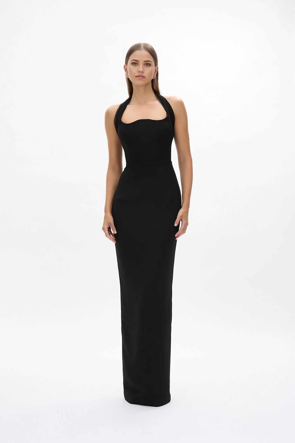 This evening dress features a sheath silhouette that fits closely for a sleek, tailored look. The square neck halter strap add a distinct touch, while the open back brings subtle lightness. The smooth fabric maintains a sharp shape, making it ideal for evening events keeping the wearer confident and composed.